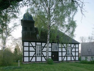 Die Saalkirche mit polygonalem Schluß und Dachreiter über der Westwand wurde 1786 in Fachwerk errichtet.