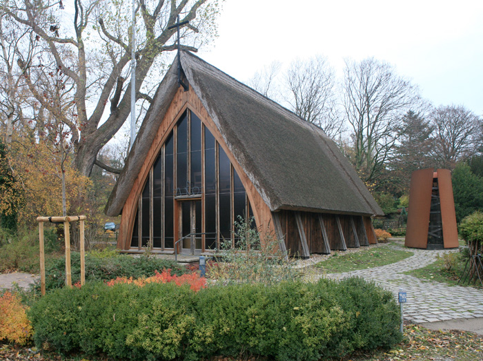 Architektur: Die Kirche besteht aus sechs Dreigelenkbindern aus Holz. Spitzbögen vermitteln einen gotischen Eindruck. Die hölzernen Rippen sind im Innern, aber auch von außen sichtbar. Sie führen aus dem Reetdach in das Fundament aus Betonbrocken. Das Innere der Kirche ist mit Ziegelsteinen gepflastert. Die Wände und Decken bestehen aus übereinander gestülpten Brettern. Der westliche Giebel ist vollständig verglast und verfügt über eine Empore. Zwei hohe, schmale, Fensterbahnen links und rechts sorgen für Licht am Altar.