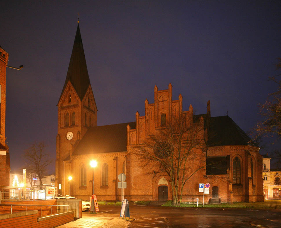 Ausstattung: Der gotische Schnitzaltar ist als Triptychon ausgeführt. Er wurde 1475 von einem Danziger Meister geschaffen. Im Mittelteil stehen hinter- und nebeneinander verschiedene Figuren, die durch eine Mittelsäule getrennt sind - auf der linken Seite sieben männliche, auf der rechten Seite sieben weibliche Figuren. Links in der vorderen Reihe der segnende Christus, der heilige Georg, Nikolaus und Johannes, der Täufer. Dahinter der heilige Mauritius als Mohr, Papst Gregor und ein Bischof. Auf der rechten Seite vorn Maria, Maria Magdalena mit der Salbenbüchse oder die heilige Barbara mit dem Turm, die heilige Katarina und Dorothea. Dahinter stehend drei Heilige, darunter die heilige Agnes mit dem Lamm. Im linken Flügel des Altars werden sieben Apostel und der heilige Stephanus mit drei Steinen im Arm dargestellt, oben Petrus, Andreas, Johannes und Bartholomäus. Im rechten Flügel die Apostel Paulus, Jakobus d. Ä. als Pilger und Judas Thaddäus mit der Keule; oben zwei weibliche Heilige, darunter die heilige Elisabeth. Auf der Rückseite der Flügel befinden sich Gemälde mit den Darstellungen des Apostel Paulus, der heiligen Katharina und der heilige Nikolaus, dem heiligen Georg, der heiligen Dorothea und einem König mit Becher und Hellebarde. Die Predella schmückt ein Gemälde mit fünf gemalten Halbfiguren: Christus, die heilige Elisabeth, Maria Magdalena, Agnes und Barbara mit Kelch. Der Altar wurde 2009 restauriert.