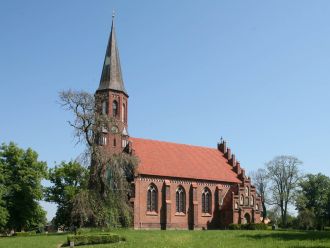 Die neugotische Kirche wurde von 1875-77 errichtet. Der rechteckige Backsteinsaal auf Feldsteinsockel ist mit einem Westturm und einer eingezogenen Chornische ausgestattet.
