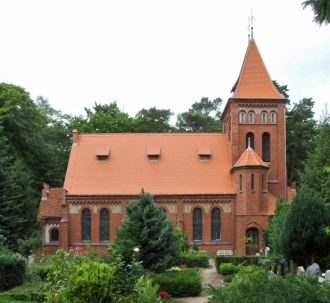 Die neugotische Kirche wurde von 1875-77 errichtet. Der rechteckige Backsteinsaal auf Feldsteinsockel ist mit einem Westturm und einer eingezogenen Chornische ausgestattet.