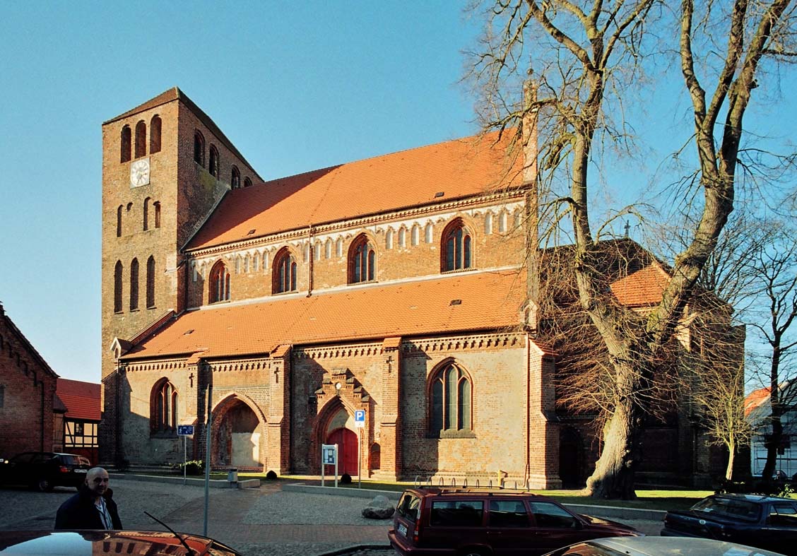 St. Georgen wurde etwa um 1225 aus Feldsteinen errichtet, etwa 1300 das Kirchenschiff als dreischiffige Basilika von vier Joch Länge in Backsteingotik gebaut. Der quadratische Westturm ist aus dem Jahr 1414.Er weist im Obergeschoss eine große Anzahl rundbogiger Schallöffnungen und ansonsten ziemlich viele Rund- und Spitzbogenblenden aus Backstein auf.